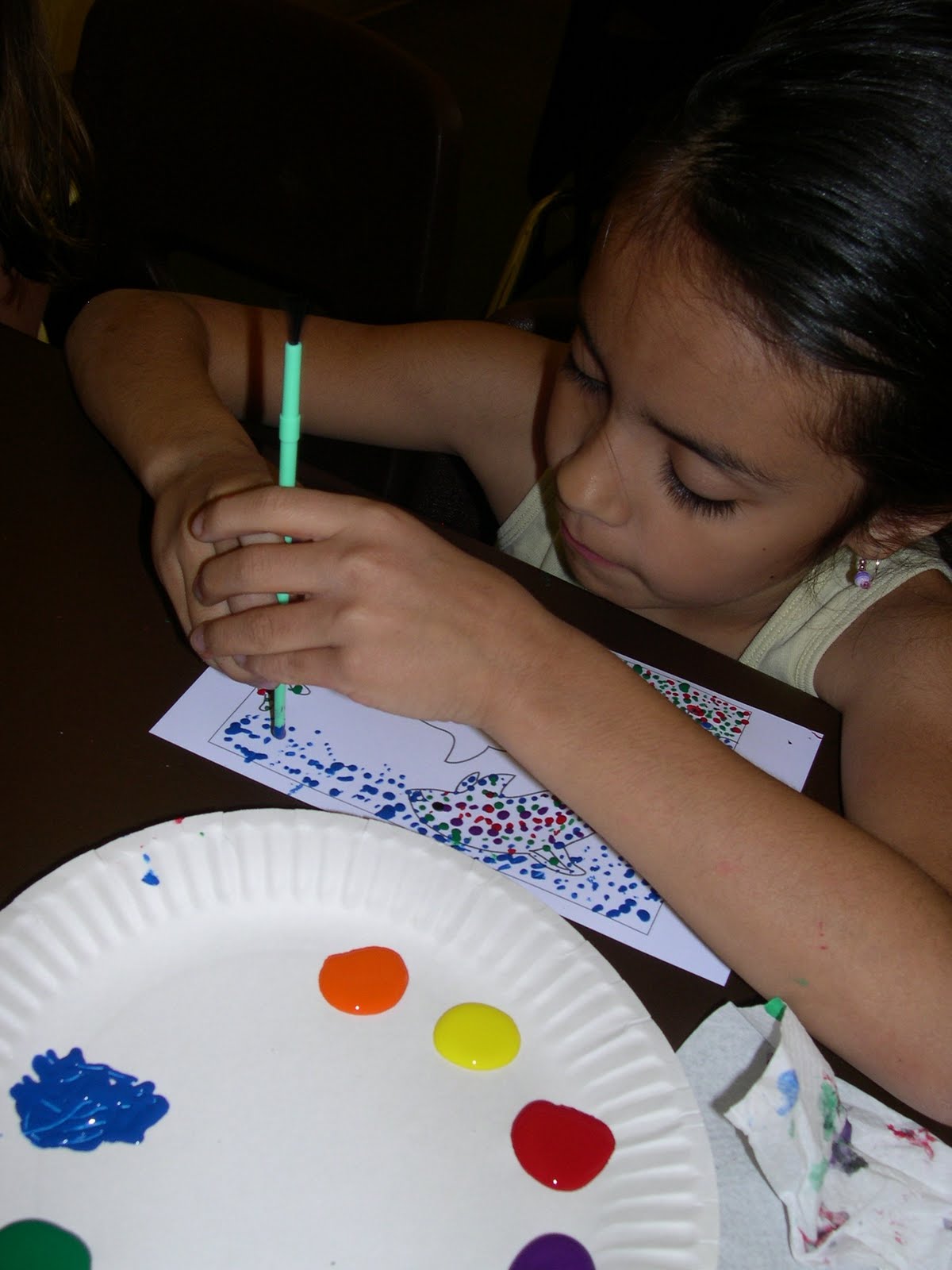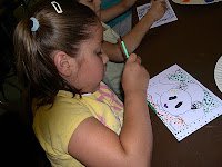 Rachel showed students her notebooks with various phases of her illustrations -- sketches, thumbnails, drawings with color washes, and finally the pointillistic finishes that make these illustrations so arresting. She gave them templates made from some of the book's illustrations. Then she showed them how to use the ends of their paintbrushes as if they were tips of sticks, and to space the dots for the strongest effect. The students were completely immersed and did some splendid work.